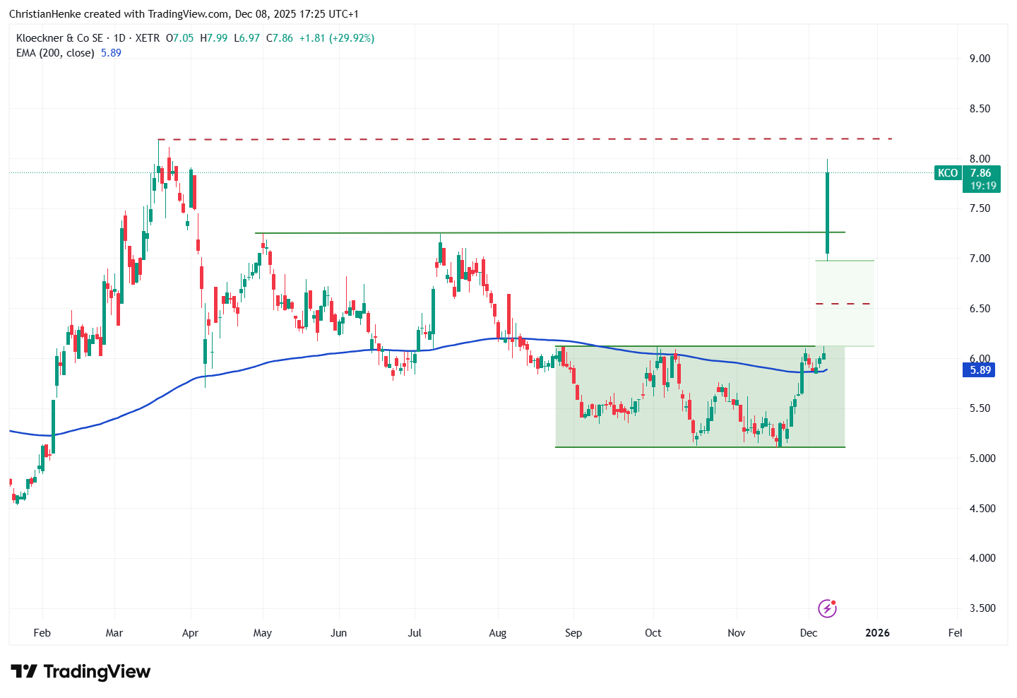 Charttechnisch sieht es nach einem Befreiungsschlag aus. Die Oberseite der Handelsspanne bei 6,11 EUR sowie die beiden Hochs bei 7,24/7.25 EUR stehen vor dem Fall. Ein Schlusskurs oberhalb der genannten Hürden wäre empfehlenswert.