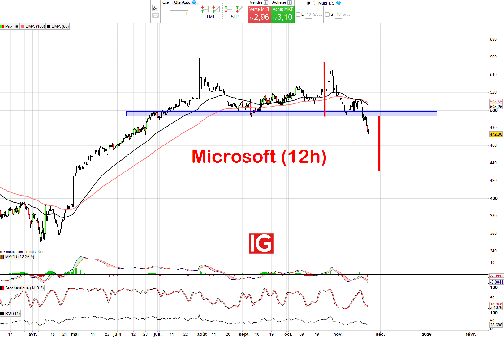 La correction sur Microsoft, troisième plus grosse valeur du Nasdaq100 en termes de capitalisation boursière (3560 milliards$) a commencé fin octobre et s’est poursuivie ces derniers jours malgré une tentative de rebond sur la zone des 493$ il y a quelques jours.