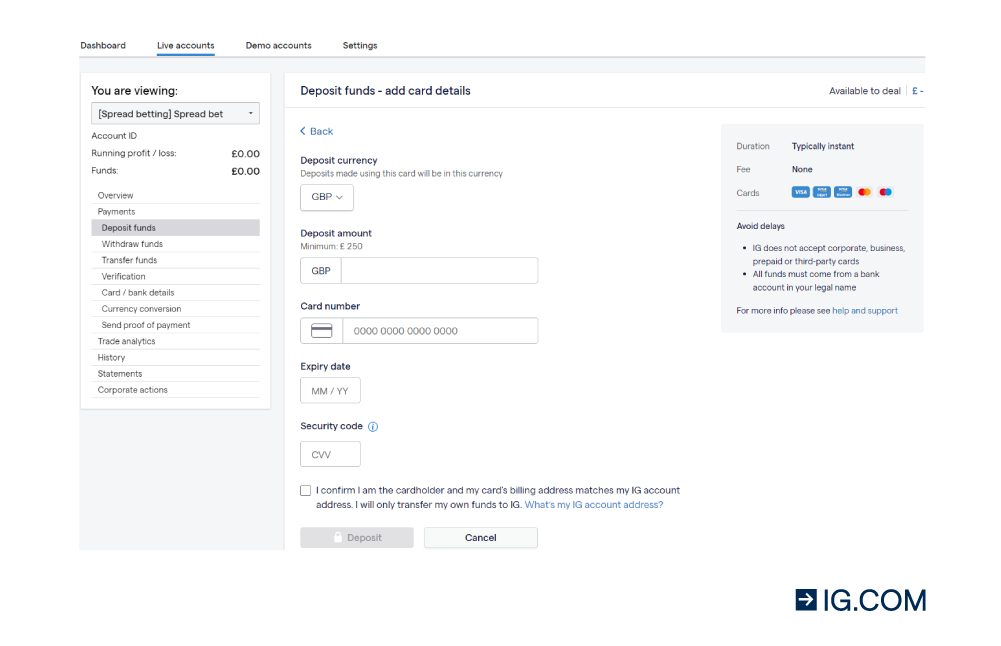 If you use this method, make sure that your card details match the name and address on your IG account . Any successful payments are deposited immediately.