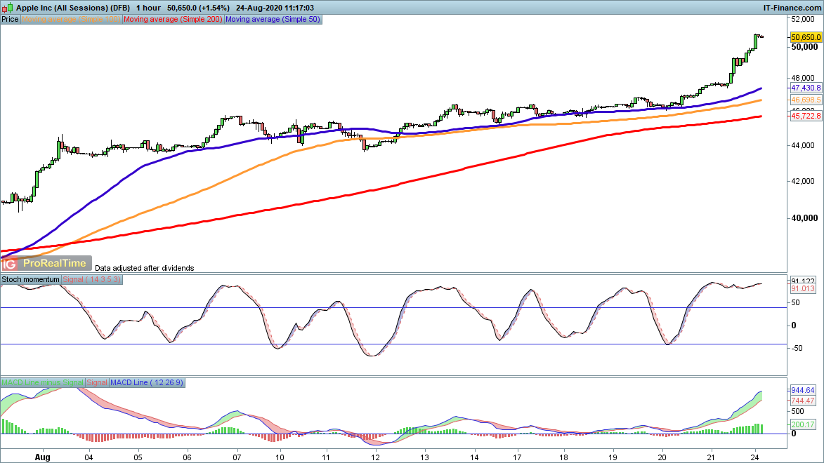 It hardly needs saying, but Apple has been one of the best performers since the low in March, rallying 140% in price terms since the 23 March bottom. The only real weakness in the price came in late July, when the price finally moved lower for a time and neared the 50-day SMA. From there it has barely looked back and is set to open at a new record high today.