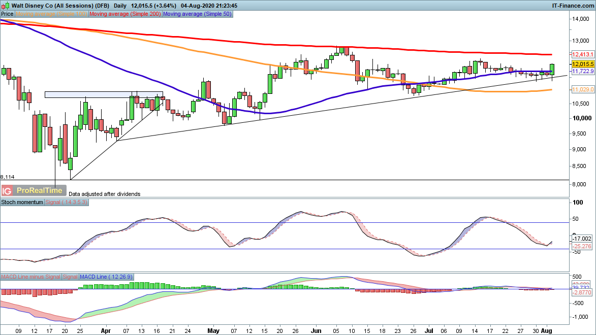 Like so many stocks Disney has seen its rally from the March lows falter. It hit $130 in June but then dropped back. However, late June saw a higher low at $109, and a possible higher low at $115 ahead of earnings appears to confirm the bullish trend. IF we see this higher low continue to hold, backed up by bullish crossovers in stochastics and MACD then a resumption of the move higher may be in play.