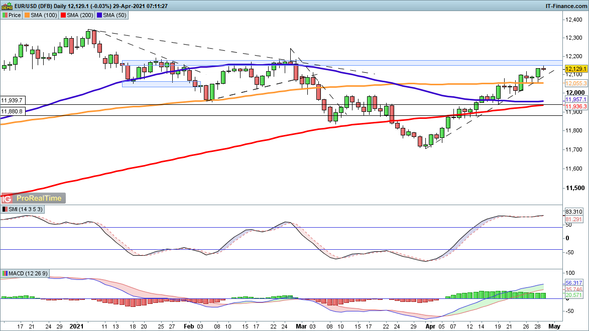 The straight-line move shows no sign of slowing and is on course to test the area just below $1.22 again, as it did in January and February. From there further gains head towards $1.2350. Rising trendline support from the March low has supported the price over the past month, with no sign as yet of a drop below this. A move below $1.2085 could signal the start of at least a short-term retracement.