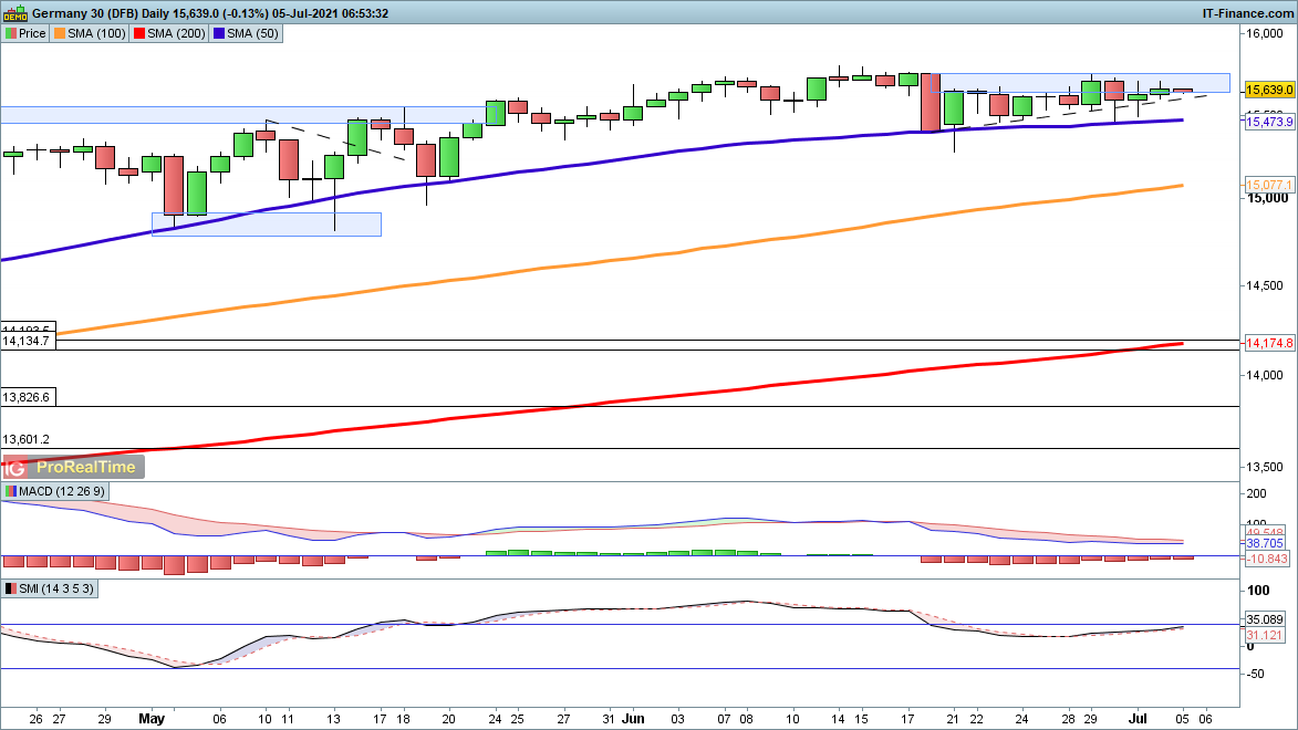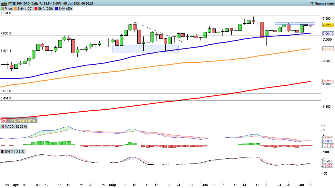 Gains for the FTSE 100 over the past two weeks have stalled at 7150, while in the short-term higher lows and a rising 50-day simple moving average (SMA) at 7061 continue to provide support. Bulls will be looking for a break above 7160 in order to open the way to the June peak at 7200, while sellers will be hoping that they can hold the price below 7150 and then drive it back below 7040.