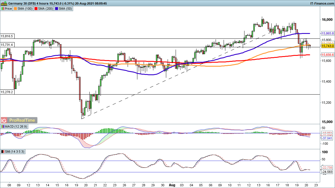 Here the bounce appears to have stalled, as the price retreats from 15,816. Yesterday’s low around 15,640 will need to hold if the bullish view is to remain broadly in place.