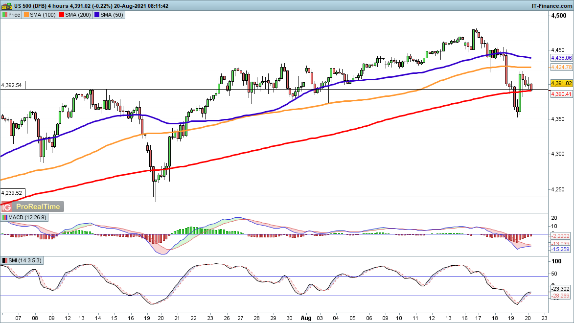 Below 4360 and the S&P 500 heads towards 4240, while a rally above 4420 restores the bullish view and brings 4480 into play.