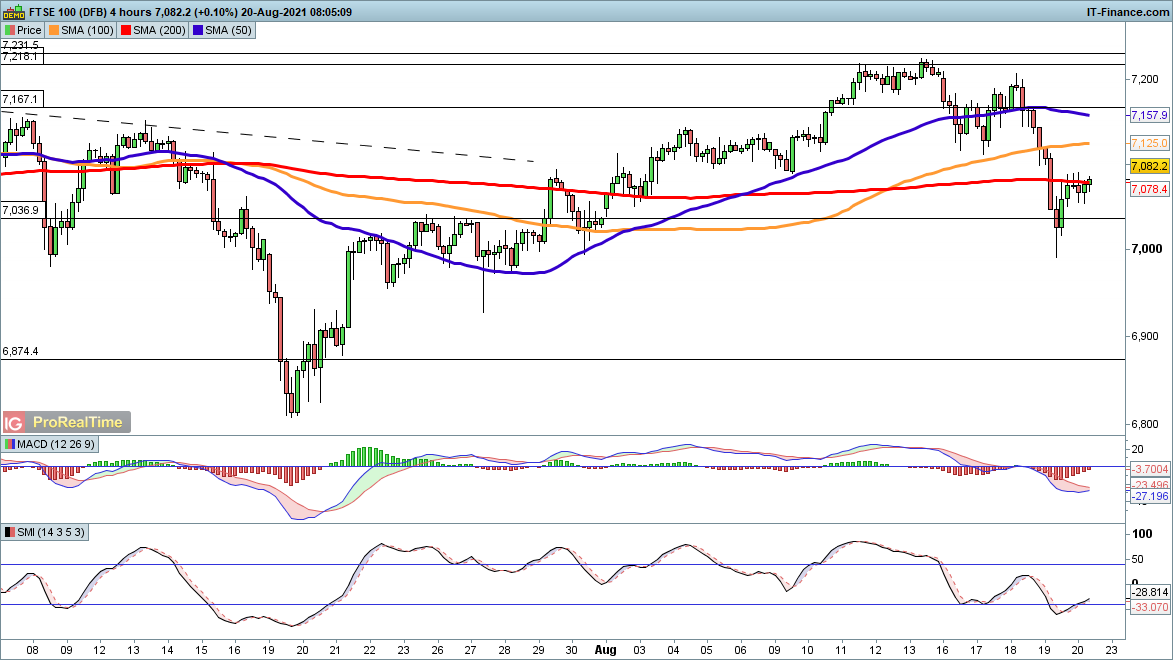 A bounce from yesterday’s low around 7000 helps to negate some of the negative view for the FTSE 100 with dip buyers aiming for further progress back to 7200 and higher, driven by recovering risk appetite.