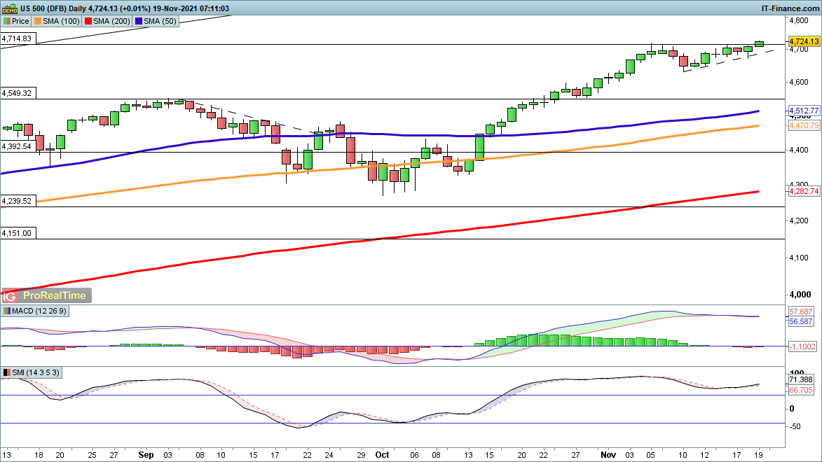 Thanksgiving is now in sight in the US, and this often sees markets rally into the holiday. While the index does look overextended, at least visually, it has not yet been particularly bothered by this, despite the yawning gulf between the price at 4724 and the 50-day simple moving average (SMA) at 4512.