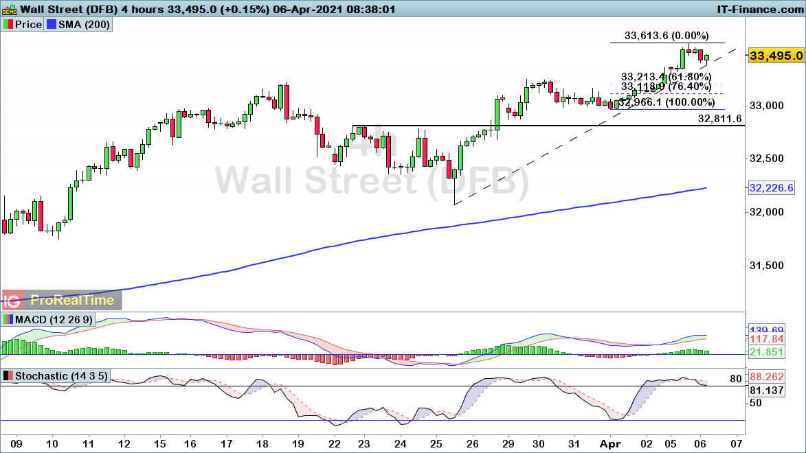 The Dow has weakened into an ascending trendline in early trade today, coming off the back of a push into record highs yesterday. However, that bullish trend remains in play despite today’s weakness, with this pullback looking to provide a potential buying opportunity unless price falls back below the 32966.