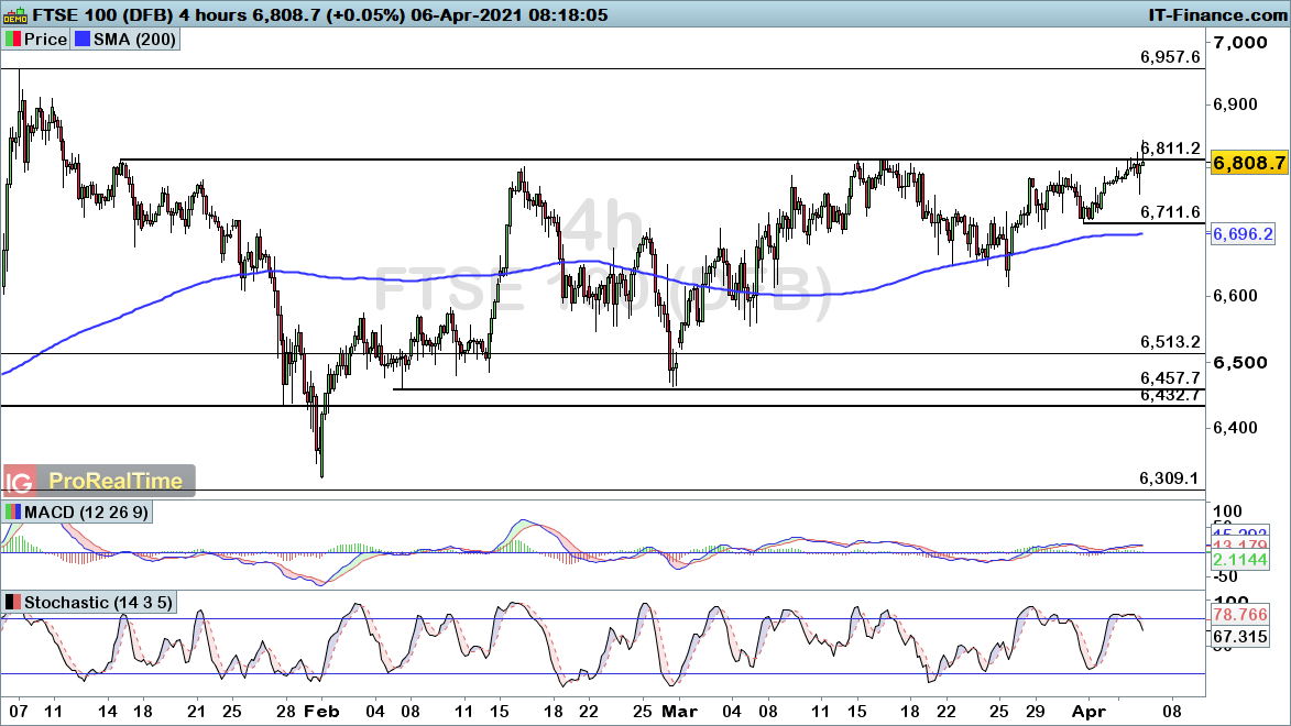 The FTSE 100 has pushed through the 6811 resistance level in early trade, with the index looking to finally exit a consolidation phase that has been playing out over the past three months. The break signals a potential continuation of the intraday uptrend seen over the past fortnight, with higher lows continuing to underpin a bullish bias here. With that in mind, further upside looks likely from here, with a break back below the 6711 level required to negate that bullish outlook.