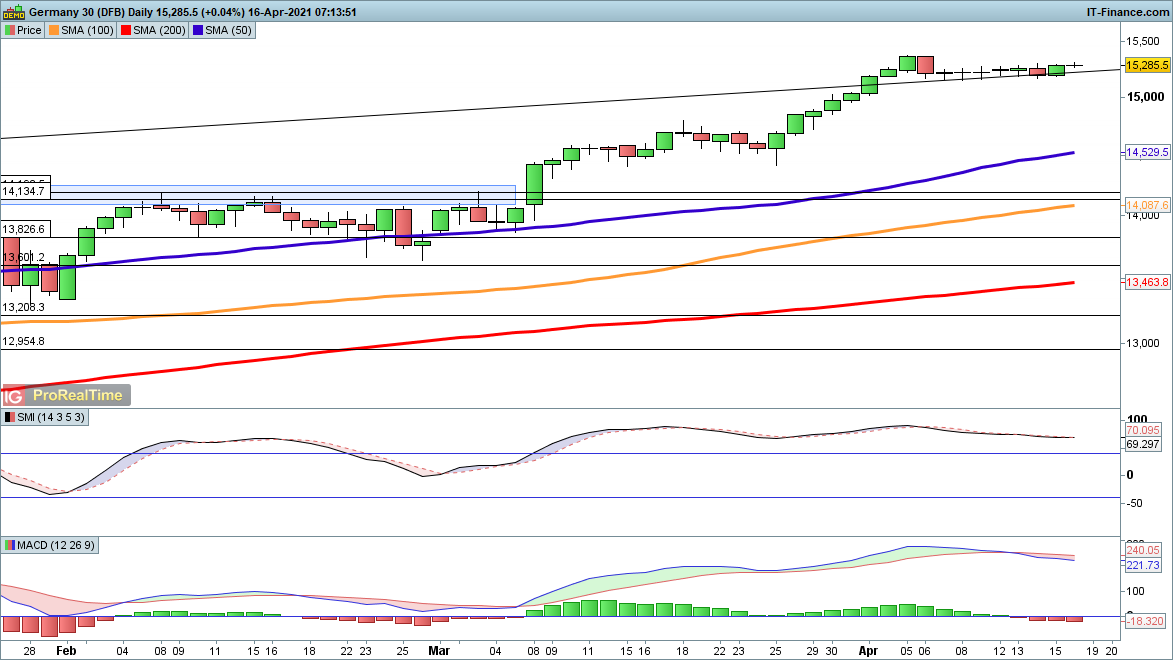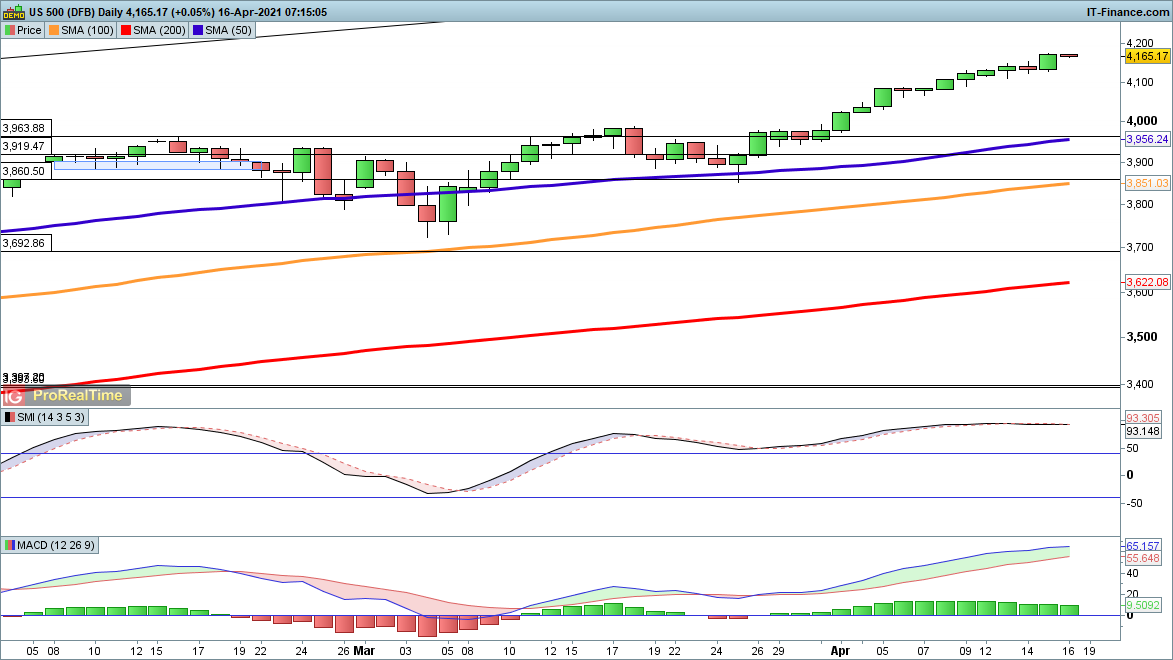 A new record high yesterday leaves the S&P 500 firmly in its uptrend. Further gains will take it on towards 4200 and a new peak, and while there is a yawning gap between the price and the 50-day SMA at 3956, so far the sellers are unable to muster up the required bearish momentum and price action.