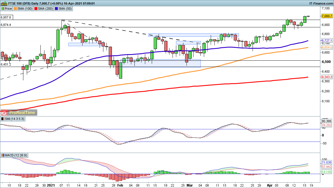 The FTSE 100 has staged a break above the peak from last week, and now sits at its highest level in over a year. Further gains target 7230, and from there 7670 comes into view. The ongoing uptrend has been reinforced by this latest higher high, and so far there is little sign of any reversal currently in play.