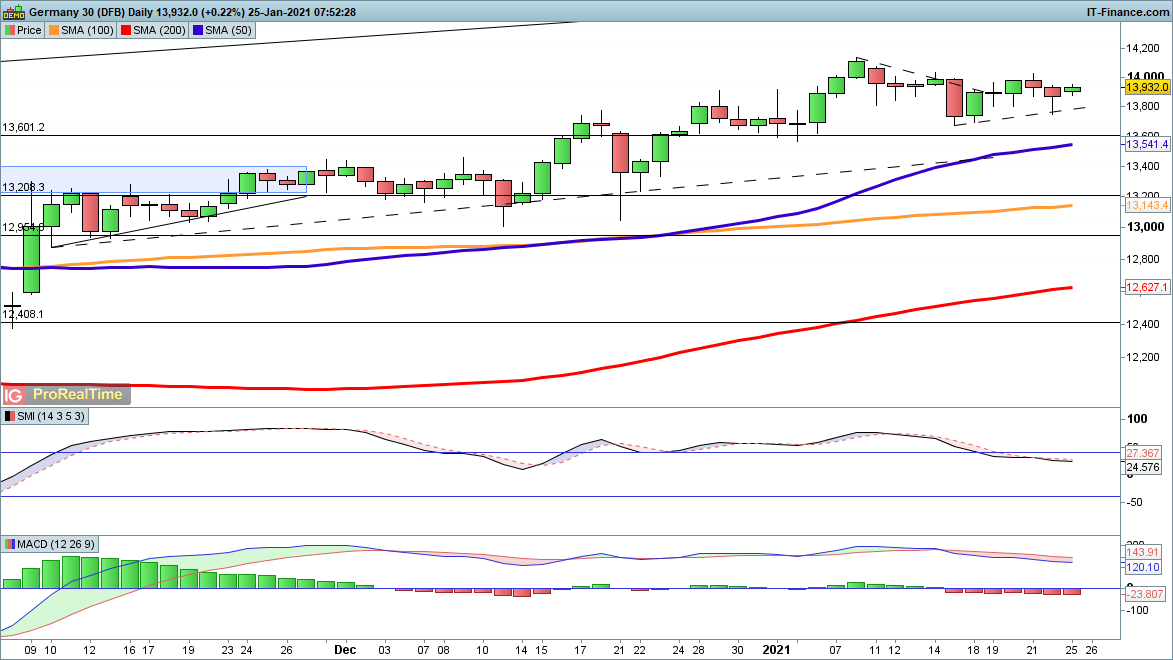 After dipping below 13,800 on Friday the DAX price has moved higher, targeting 14,130, the high from earlier in the month. This bullish view persists unless we see a move back below 13,800 and short-term trendline support, which brings 13,600 into view.