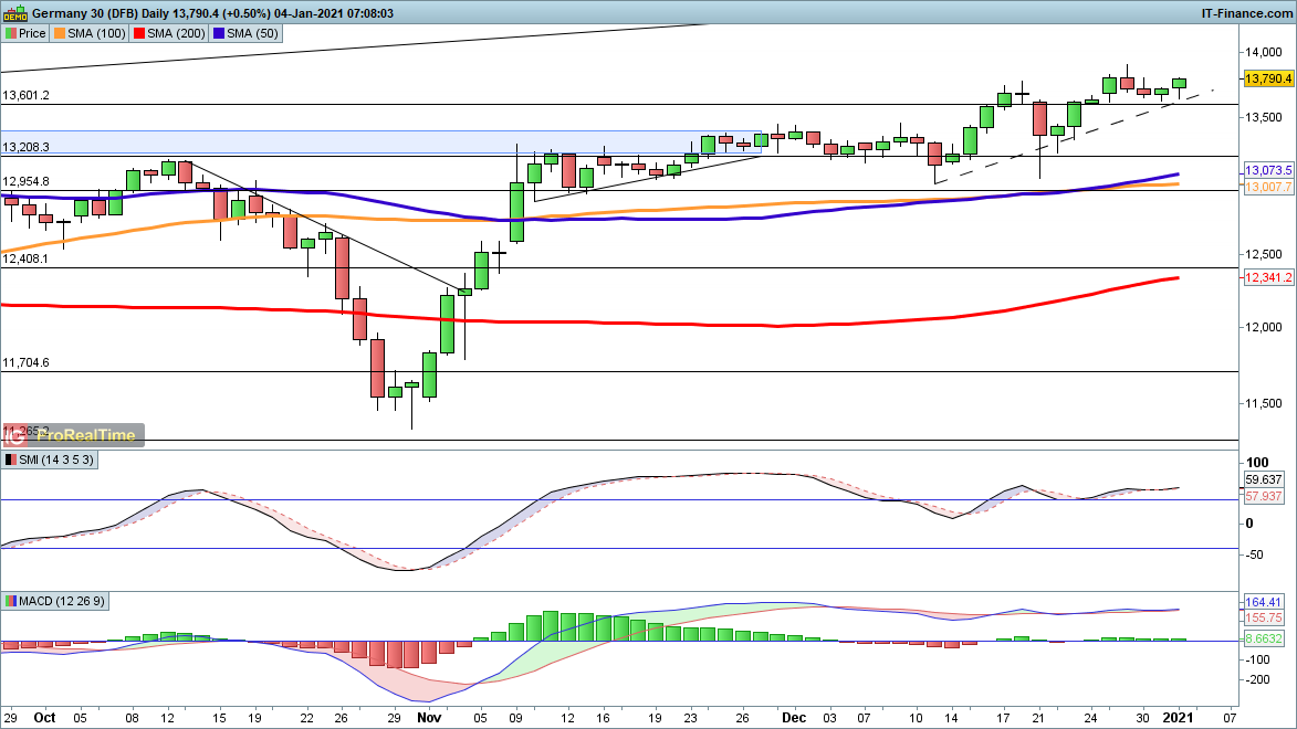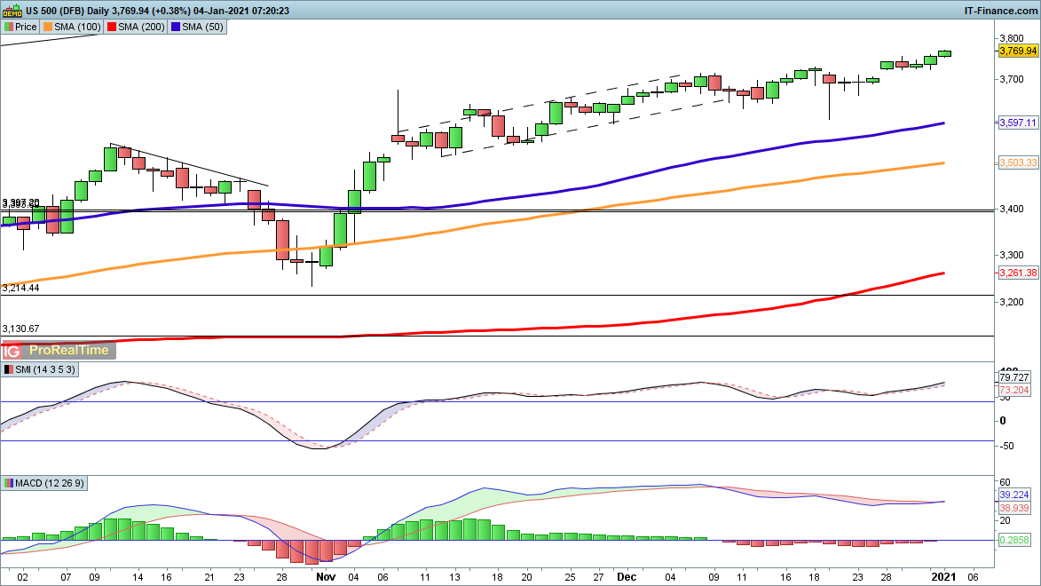 The S&P 500 begins the new year at a record high, and in a strong position. Momentum continues to rule the roost here, with the brief dip in mid-December finding plenty of buyers. So far there is little sign of any reversal in play, and with the daily MACD poised to provide a bullish crossover it looks in fact like more gains will be the theme for the coming sessions.