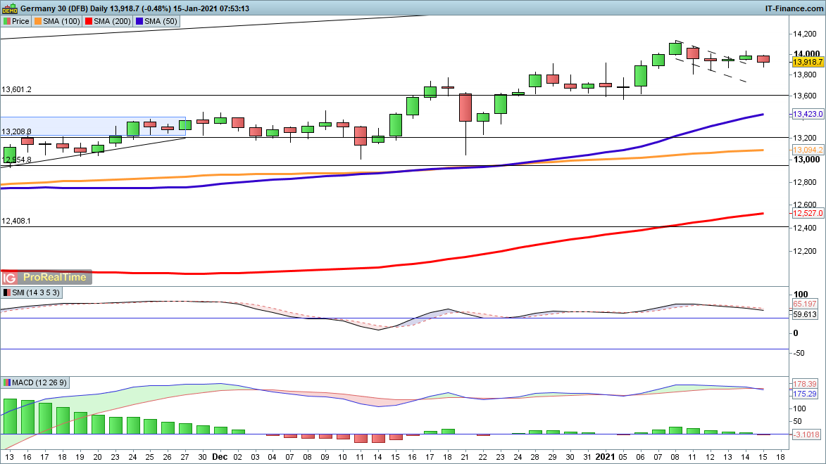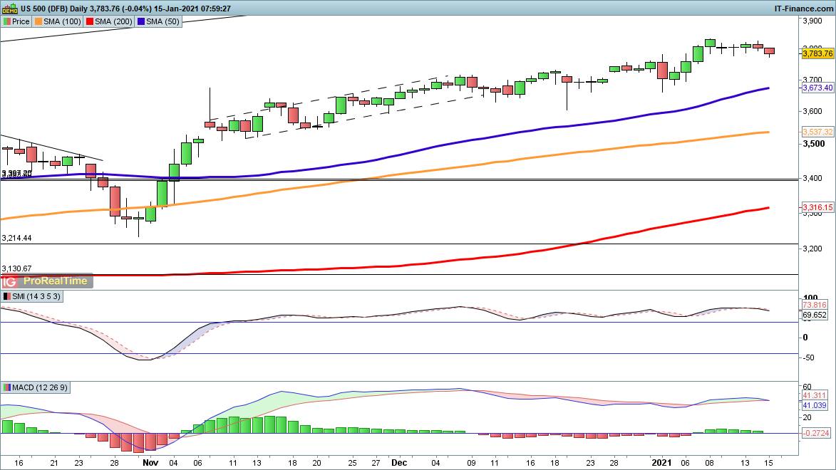 After holding all week near the highs, the S&P 500 price is seeing some weakness in the wake of the Biden stimulus announcement and ahead of bank earnings later today. Support earlier in the week came into play around 3775, so if this is lost then a move towards 3673 comes into view.