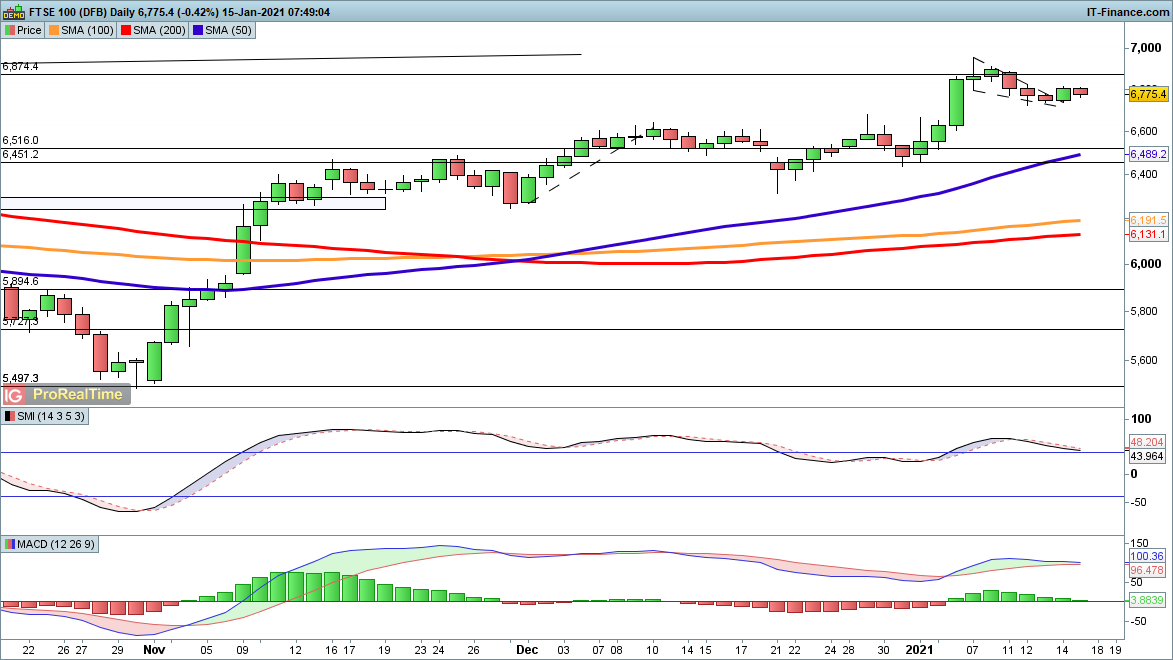 Hopes of continued gains for the FTSE 100 have been dashed so far, as the breakout from the bullish wedge fails to make further progress. A reversal below 6700 is a bearish development and brings 6600 into view. A more bullish outlook would come with a move above 6815 that could then bring 6915 into view.