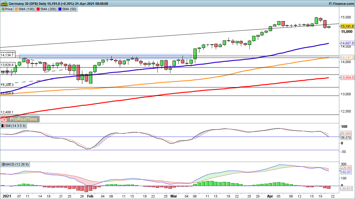A second day of losses has seen the index give back the brief upward surge to 15,500, and now a further decline could be in play. Previous selloffs this year have been rare, but the two of any note have stabilised around the 50-day SMA, which currently trades at 14,607. Beyond this a deeper move towards 13,600 would be in the offing. Buyers will need to recover 15,300 to reverse the growing short-term negative view.