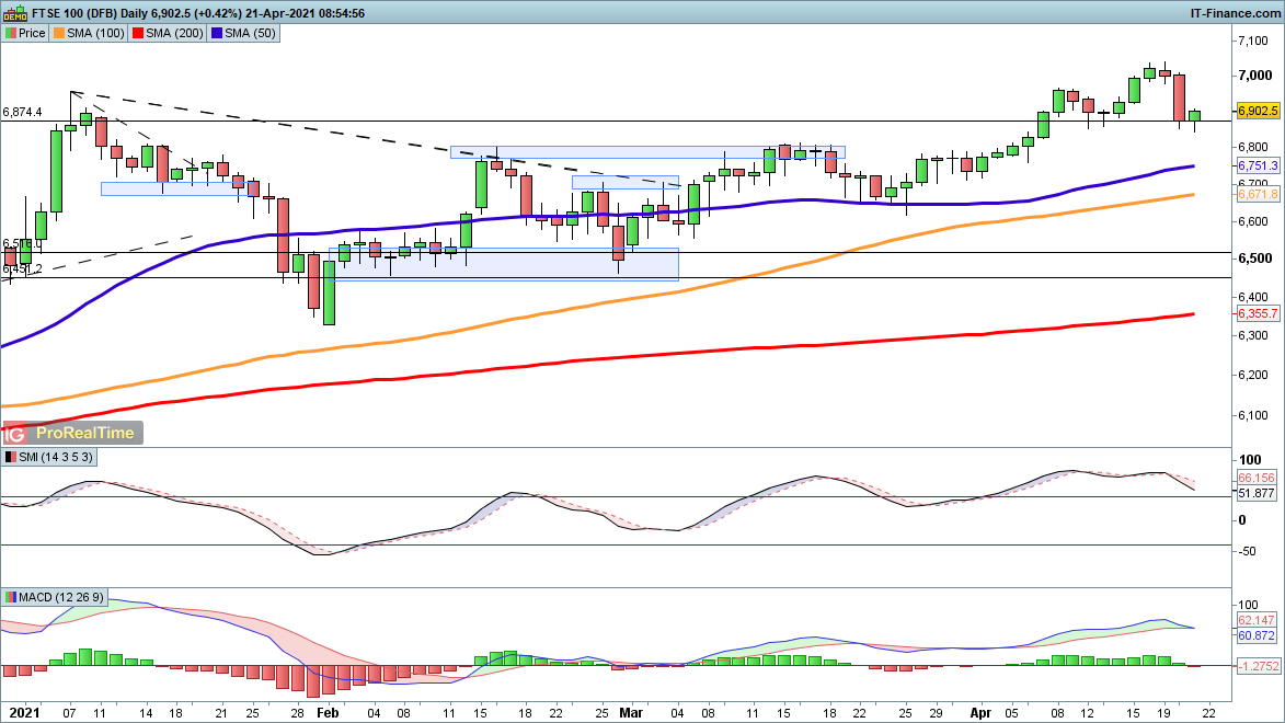 The FTSE 100 suffered a sharp reverse yesterday, wiping out the gains from last week and taking it back below the January peak. A deeper retracement could now be in play, targeting the 50-day SMA at 6751. The small bounce in the early part of the session needs to move back above 6950 to avoid bringing in more sellers to hit a potential intraday lower high.