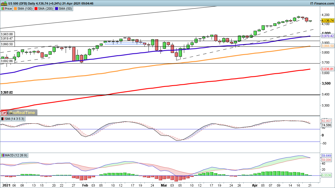The modest drop for this index pales in comparison with the declines in the FTSE 100 and the DAX, and already the futures are beginning to recover. A decline towards trendline support from the early March low would suggest a move towards 4050. Given the strength of the rally recently a revival back above 4150 is easily envisaged.