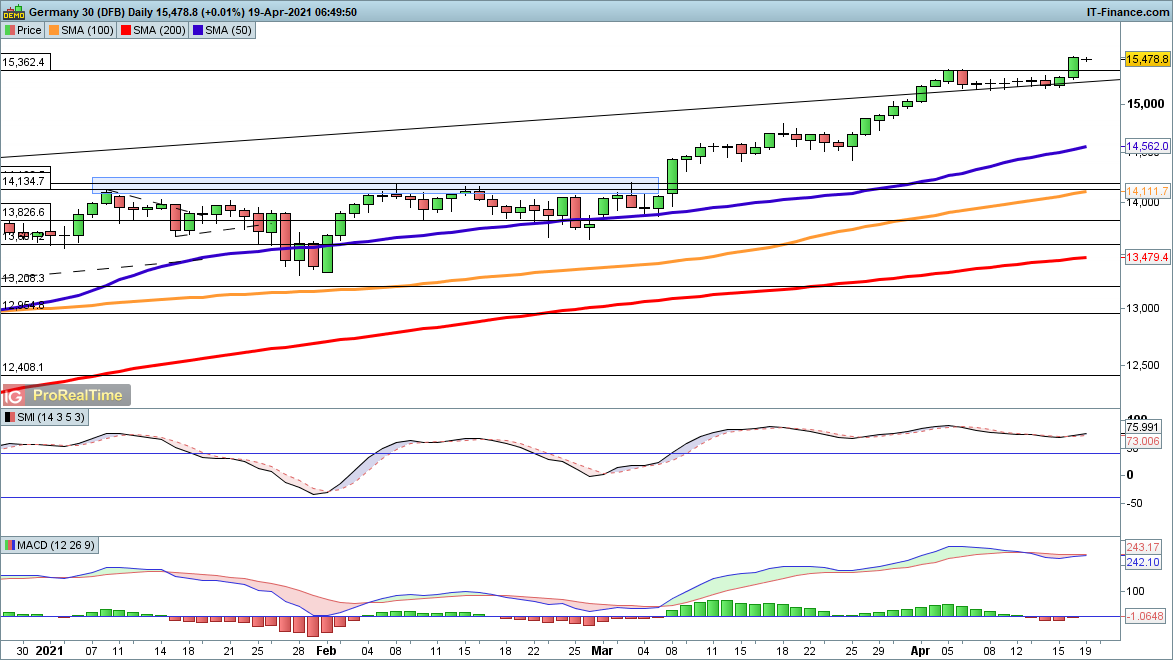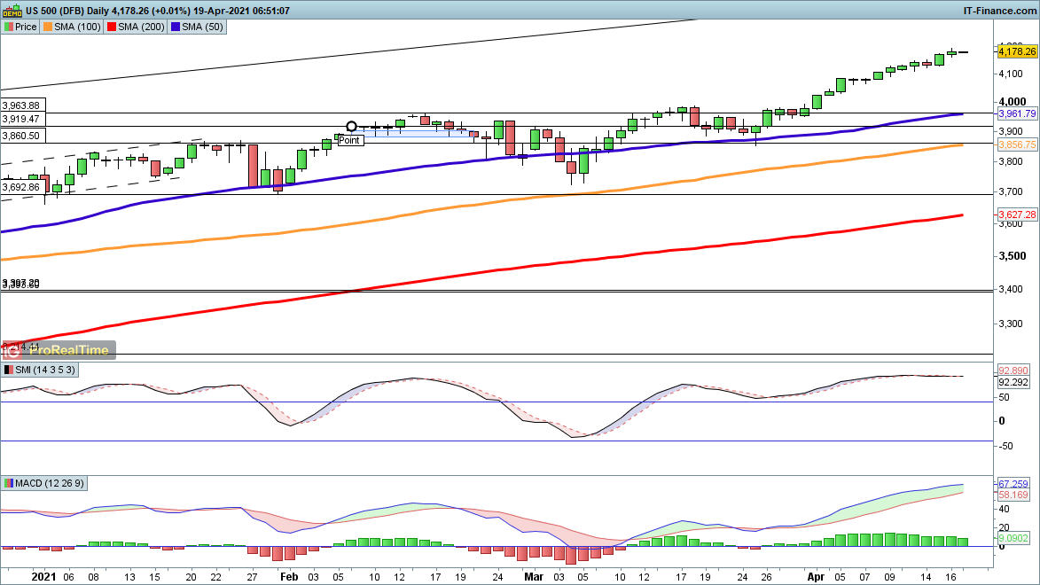 Friday’s session saw another record high for the S&P 500, but with options expiry for April out of the way and earnings season now in full flow the downside case may gather strength. However, there has yet to be a catalyst in price terms and as a result, upward momentum may continue to carry the index higher.