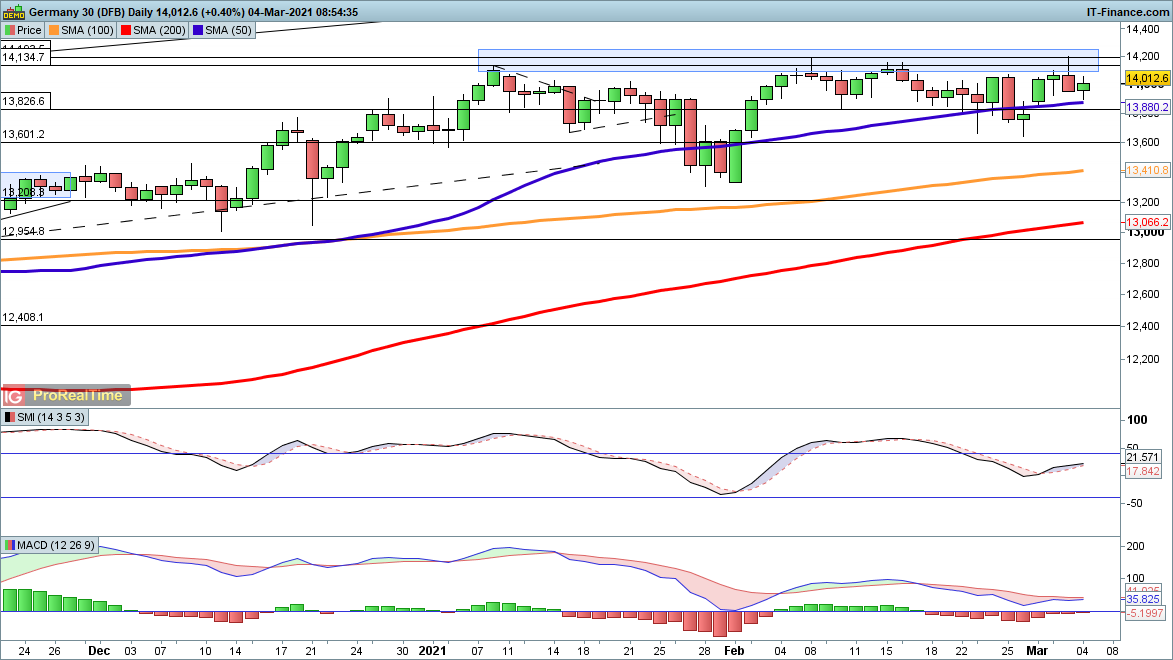 Here too we witnessed a push into a resistance zone, this time into the 14,100 area that has marked the limit of progress since the beginning of the year. It continues to hold above the 50-day SMA (13,880), maintaining a more positive view for the time being, but at some point, the DAX needs to break higher or begin a bigger retracement. For the time being the buyers appear to have the upper hand.