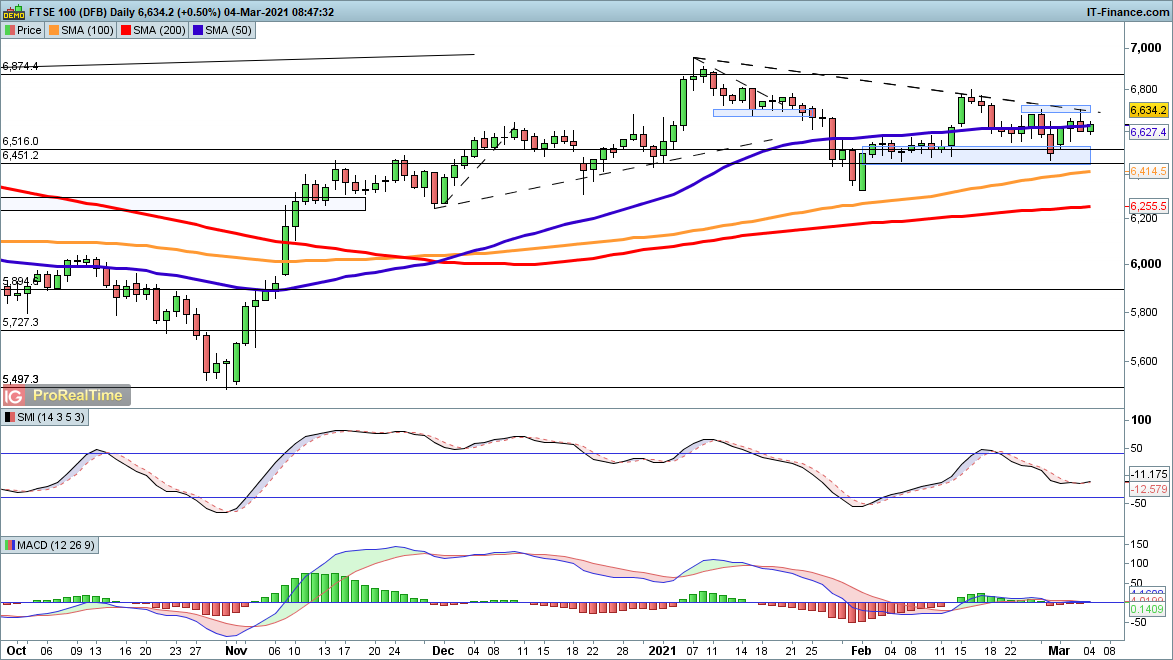 The FTSE 100 pushed towards 6700 yesterday, moving into the zone around this level that has held back progress over the past week. However, it was not able to hold its gains and fell back, finishing below the 50-day SMA once again. Another attempt this morning appears to be in the offing; clearance of 6700 is needed to provide a more near-term bullish view, and to open the path to 6800 and higher. The bearish view has been negated for the time being following the bounce from 6470.