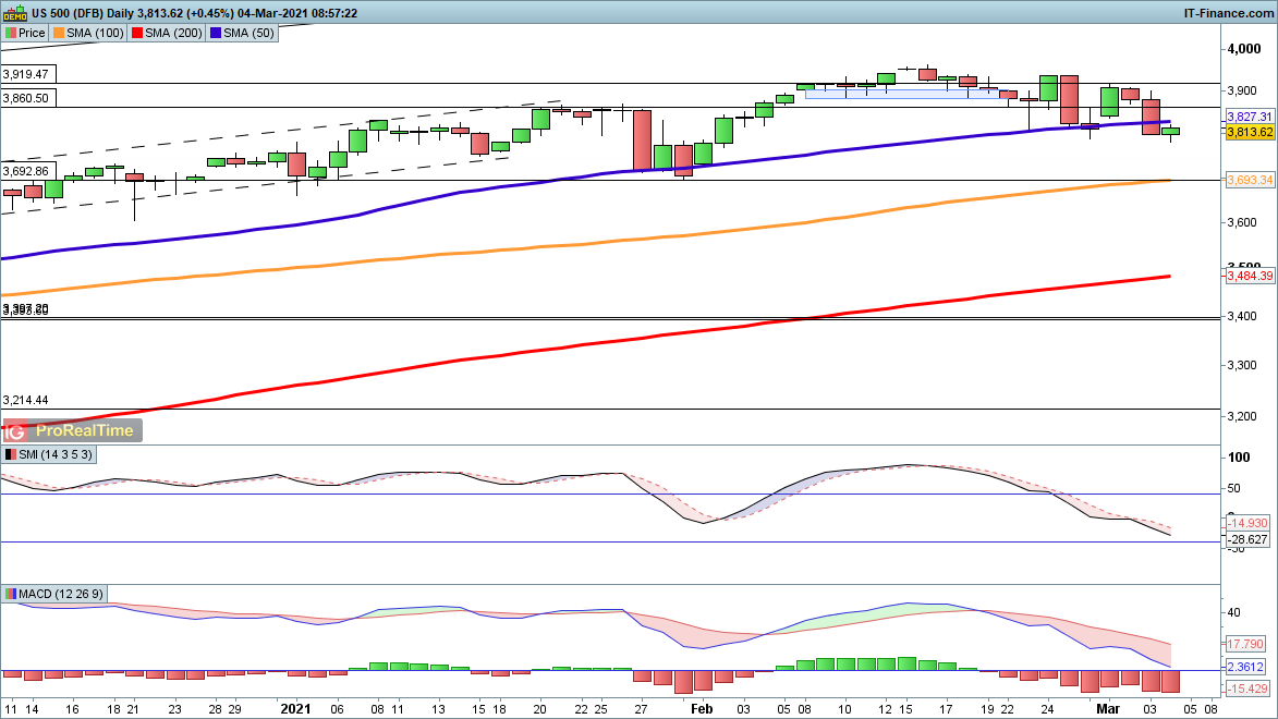 The current move lower has turned into the most sustained drop, if certainly not the largest, in months. Yesterday’s plunge took the price back below the 50-day SMA (3827), and further losses put the January low at 3690 into view. Unlike the other indices above which remain more towards the bullish end of the spectrum, the S&P 500 is still struggling to make headway, and as a result for now the sellers are still in charge. This would only change with a move above 3860 in the first instance.