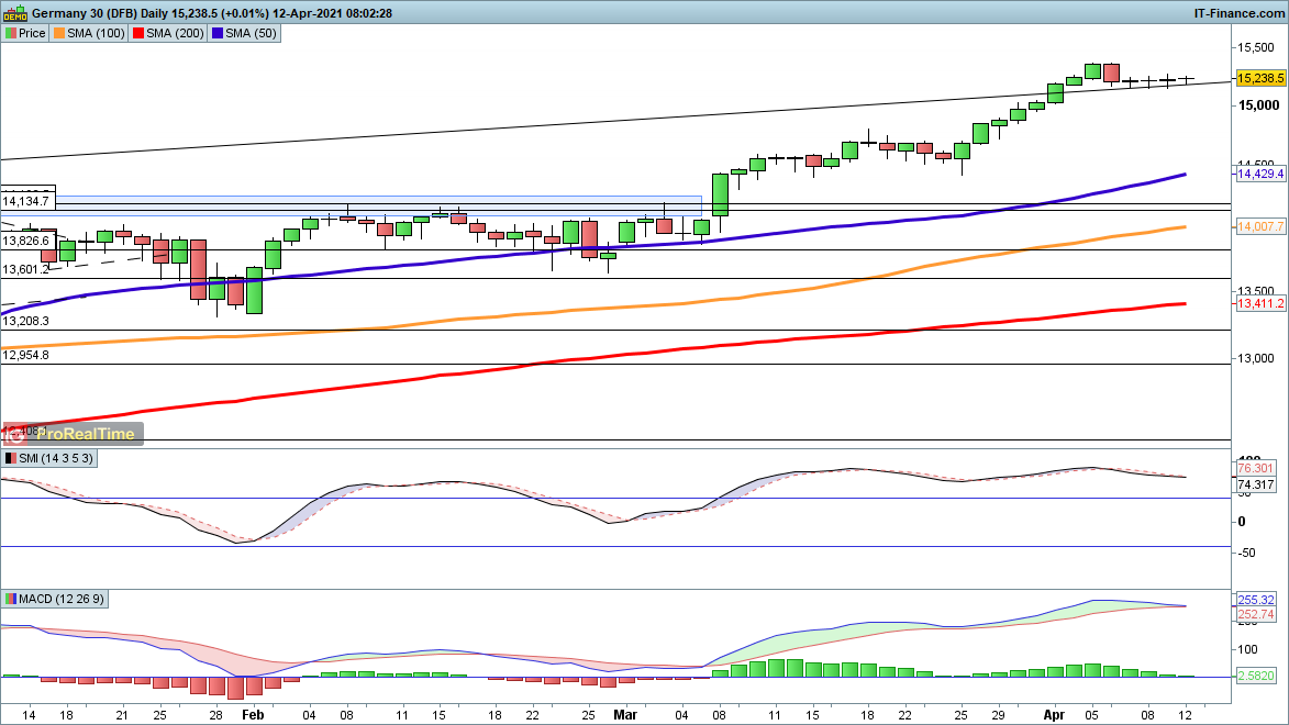 After the record peak a week ago the index has mostly drifted sideways, although early trading points towards a possible resumption of the move higher that will increase expectations of a run towards 15,500. The price has held 15,150 in recent sessions, so a drop below here could provide an indication of some near-term weakness.