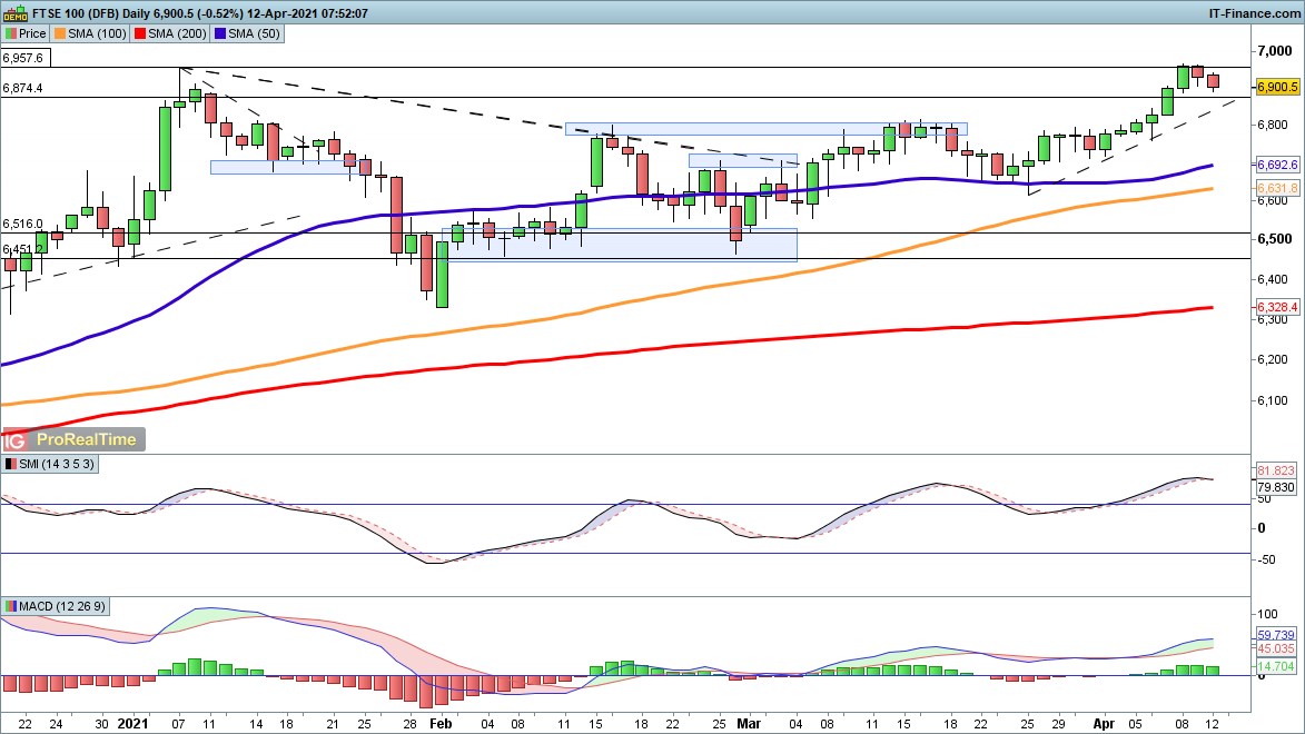 The FTSE 100 has continued to drop back from the highs seen on Thursday, with some initial trendline support possible as the price nears trendline support from the late March low. Below this the price heads towards 6775 and then the 50-day SMA at 6692. A move back above 6957 would mark a break to the upside.