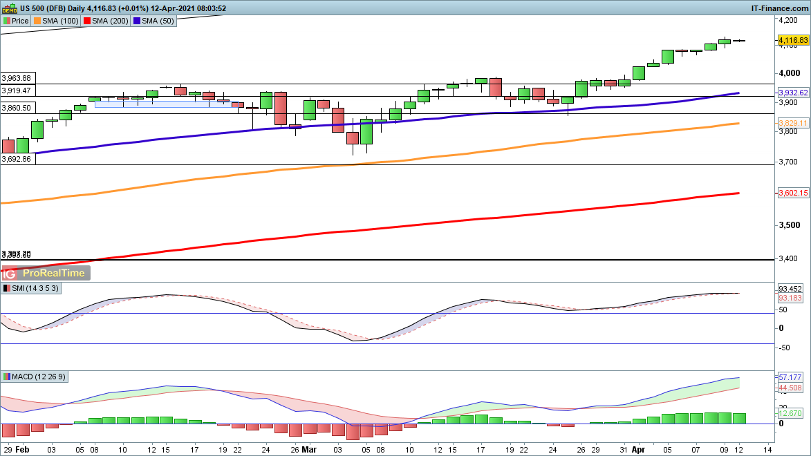 The Dow begins the new week close to where the old one finished: at a record high. April options expiry week tends to see further bullish momentum so additional gains into Friday look possible, even after the strong start to the month so far. As yet there is little in the way of bearish price action, although a reversal below 4000 would mark a likely bigger pullback.
