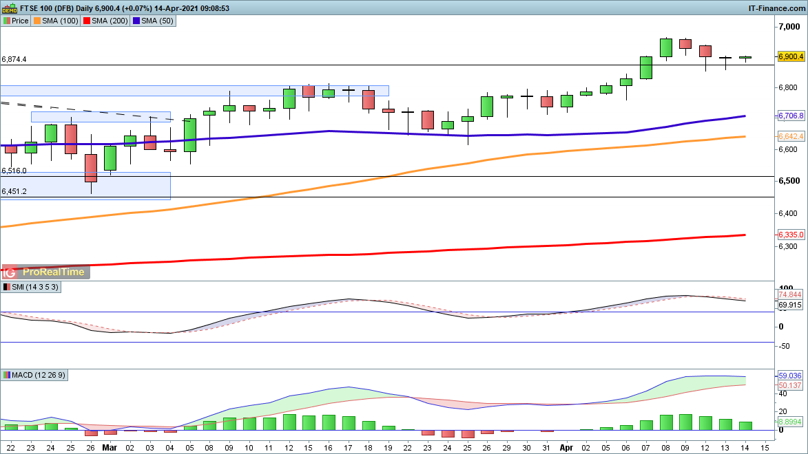 The FTSE 100 continues to edge back from the highs of last week but the rate of decline has slowed and, crucially, the lows of the week so far at 6850 have seen buying. This has stymied any further bearish progress and raises the prospect of a renewed push higher that targets 6950 and above. For now there isn’t much bullish momentum but the move down has certainly stalled.