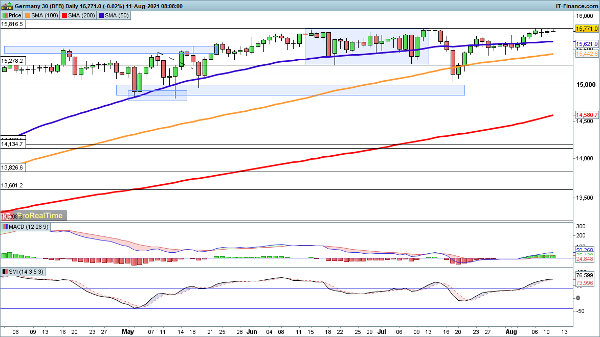The DAX continues to hover just below the highs of June and July, but shows no desire to head lower either.