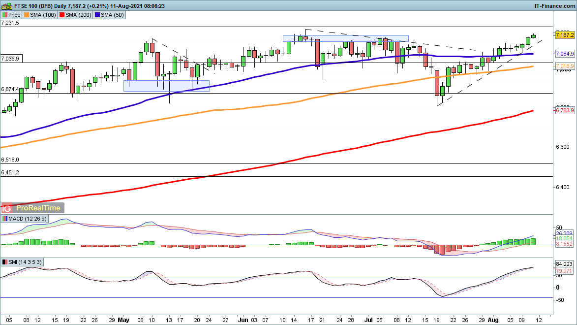 Concerns about a turn lower for the FTSE 100 have been brushed aside as the price marches on towards the June highs above 7200.