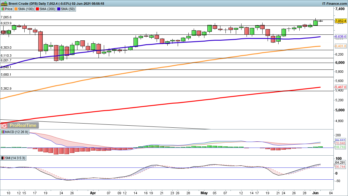 The price of Brent crude remains close to $70.85, having clambered above $70 for the first time in over a year yesterday. The bullish move of the past few days remains intact, and points towards further upside in the near-term.