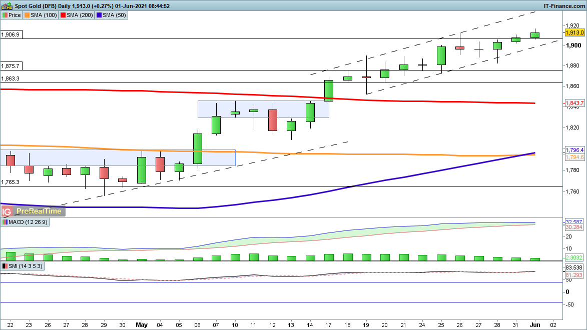 Gold has recovered from Friday’s dip towards $1880 and has pushed higher once again, remaining within the rising channel of the past three weeks. Bullish momentum continues to prevail, and Friday’s dip-buying points towards the strength of the bounce.