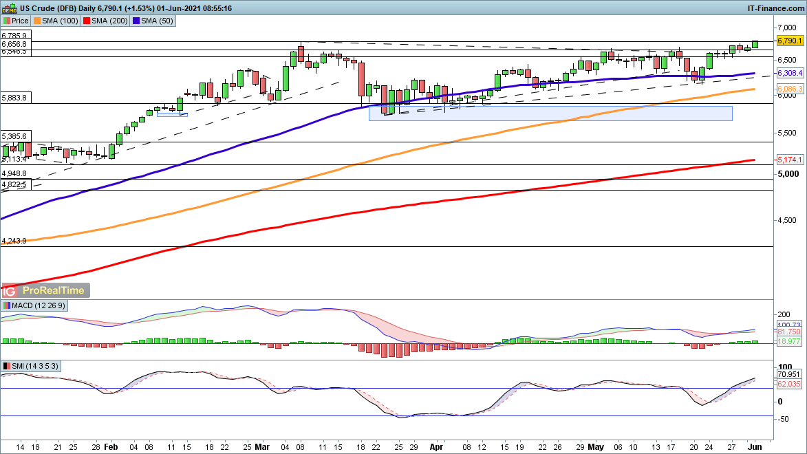 The climb in crude oil prices over the past two weeks has carried WTI back to levels last seen in early March. The mid-2018 highs at $76.81 now come into view. A break higher now seems likely, confirming the strength of the bullish trend.