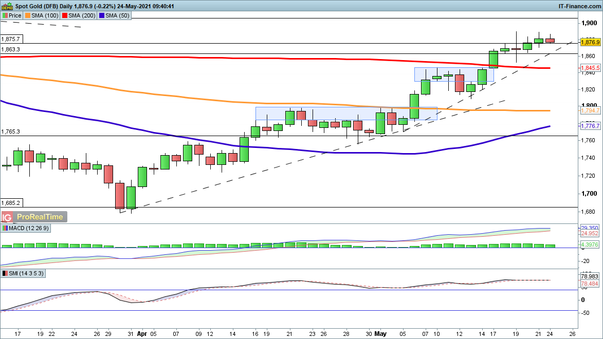 The gold price has continued to climb, clearing previous highs at $1870. For the time being the bearish view is unlikely to gain much traction, with the steady rally of recent days seeing dips being bought at every turn. Further gains head towards $1910 and then $1960 over the medium-term.