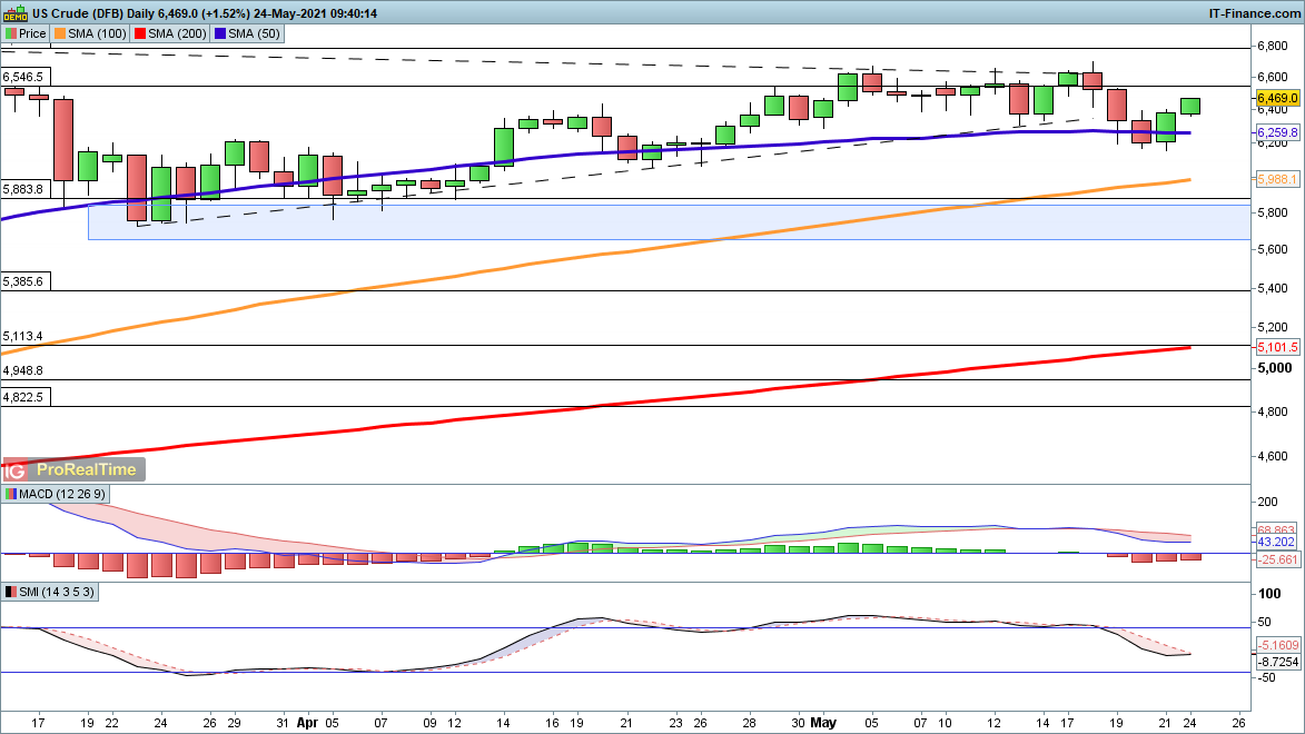 After dipping last week the price recovered on Friday and has seen further gains today, putting it back on course to $66. Having bounced from $62 the bears will need to reverse the price back below this level to revive a move lower, with another attempt to clear $66 and then $67.85 now in the offing if gains continue.