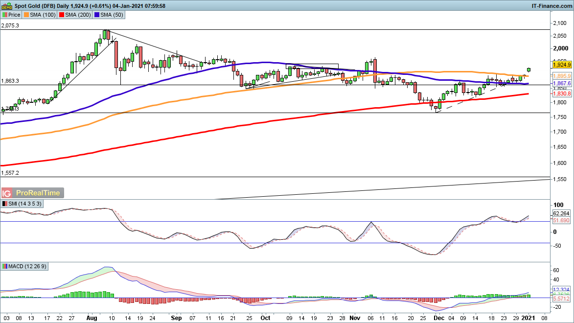 It has been a resoundingly positive start to the year for gold, which has built on the rally of December to gap up as the first full day of 2021 trading arrives. It continues to be an impressive recovery, after the declines of August-December. The price now targets $1950, with a move above here clearing the way for a push towards $2000. Those looking for a reversal will want to see the price move back below the 100-day SMA at $1895.