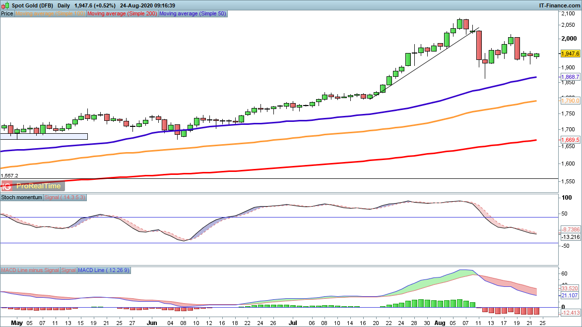 The price of gold continues to hover around $1940, helping to mark time as the 50-day SMA plays catch-up. For bulls, this is a positive development in the longer-term; the pullback will help ‘reset’ the price after its gains earlier in the summer, and will also tempt in some further short positions, providing more fuel for a rally. Continued declines in the direction of $1868, the 50-day SMA, will help provide a better risk-reward outlook in due course. Bullish crossovers in stochastics and MACD will also point towards the prospect of a recovery.