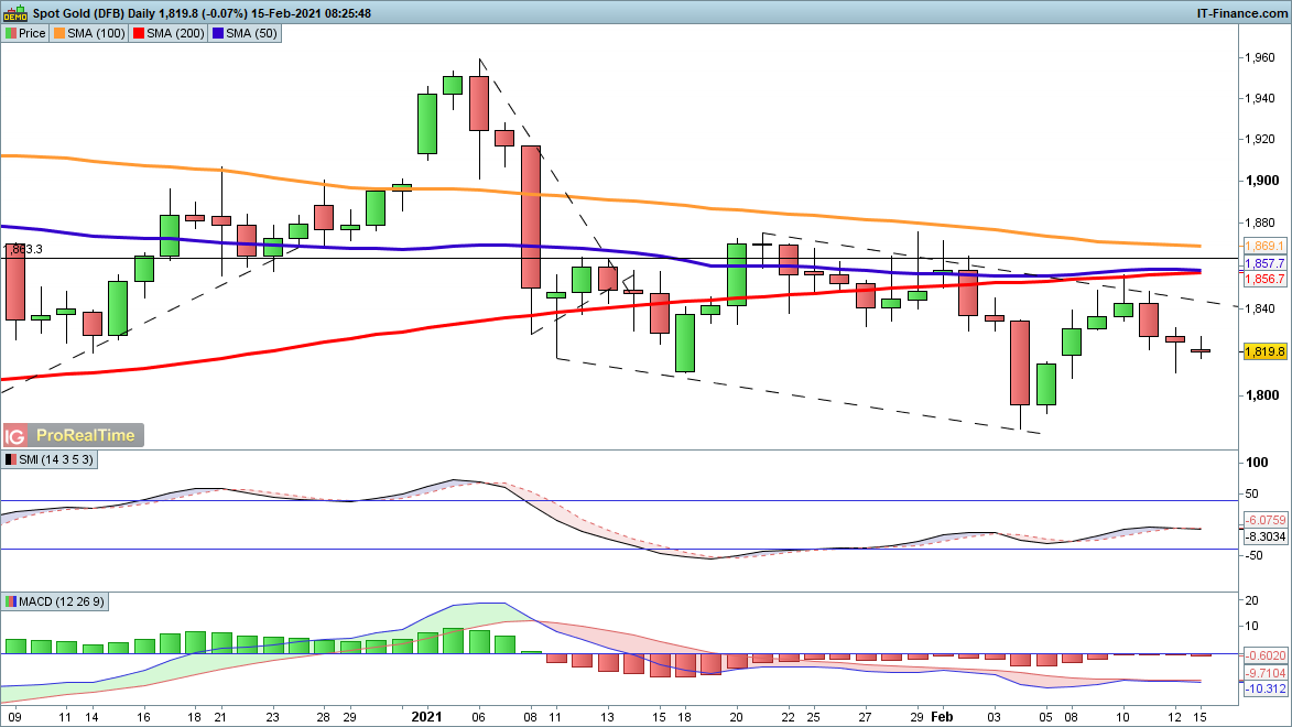 Risk-on moves in markets have not proven helpful to gold, which has resumed its downward move after a lower high last week. It has been in a descending channel for a month now, marked by lower highs and lower lows, and further declines will bring $1780 and $1765 into view. A reversal requires a move through $1857 that clear’s last week’s high and signals a breakout from the descending channel.