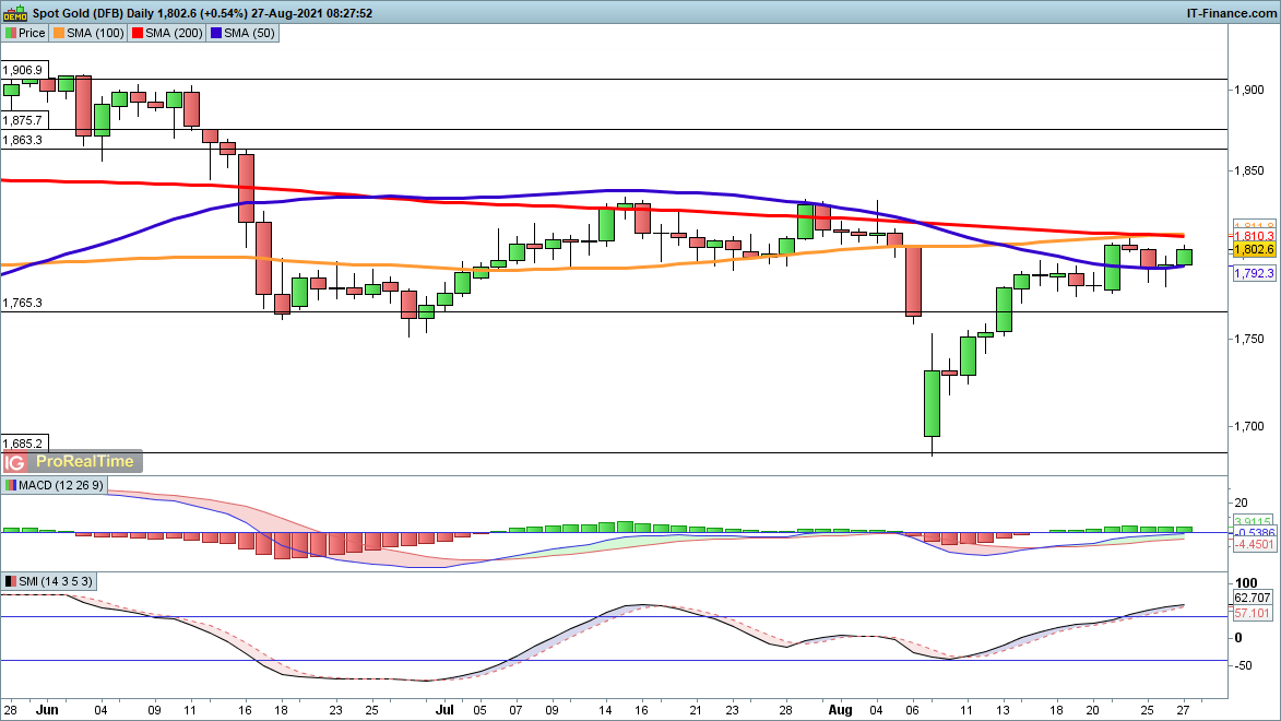After dipping to $1780 yesterday the price has recovered, and now further gains target $1810 and then $1830.