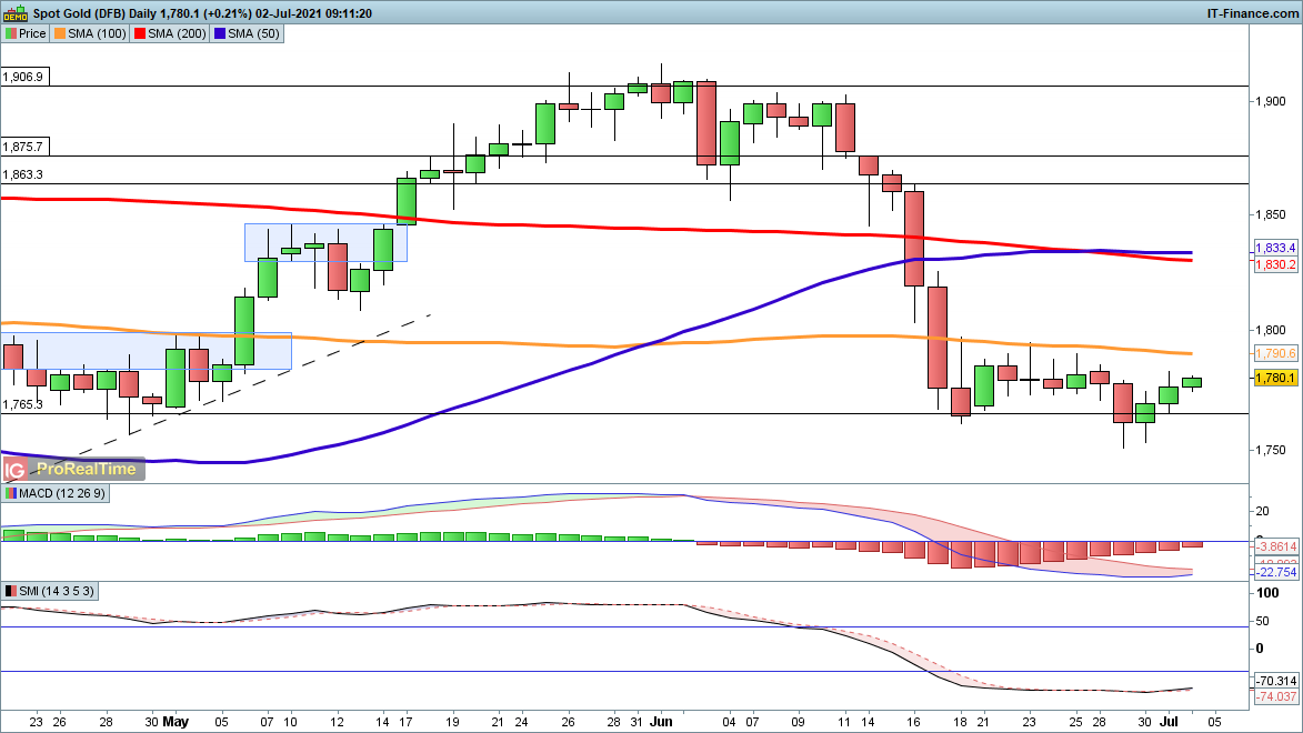 Expectations of a renewed decline have been dashed as the price continues to defend the area around $1765, although it now needs to clear $1790 to establish a potential higher low. The sellers have been unable to hold down the price, moving the view from bearish to neutral, so now we must wait either for a break above $1790 or a reversal to, and then break below, $1765.
