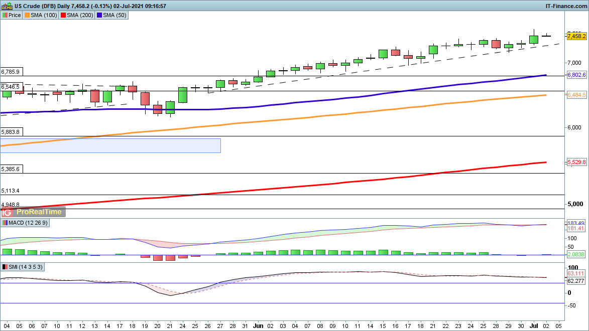 The deal yesterday by the Organization of the Petroleum Exporting Countries and its allies, a grouping known as OPEC+, allowed WTI to rally above $75, with no sign of a slowdown yet in the price’s gains. Rising trendline support from late May continues to provide the underpinning for further gains, and for now there is little bearish price action to point towards any substantial turn lower.