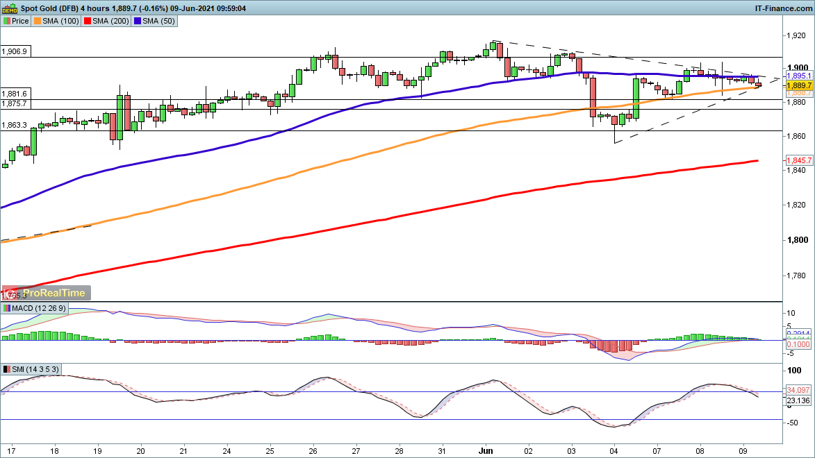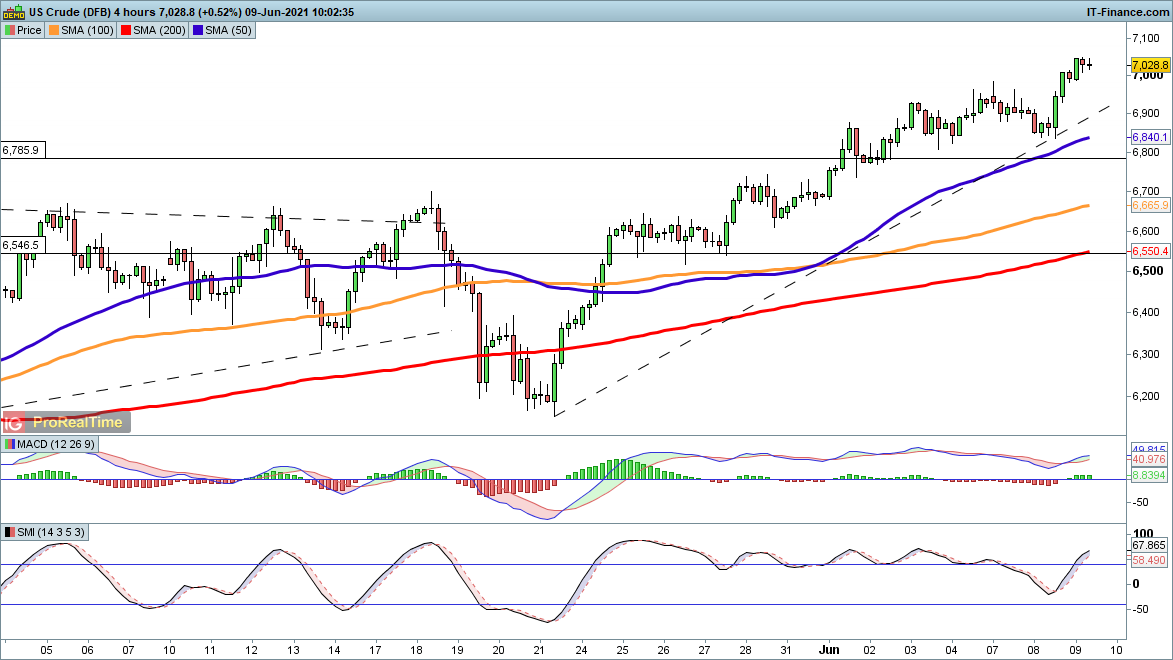 Gold is moving down again but oil’s price action remains firmly bullish.