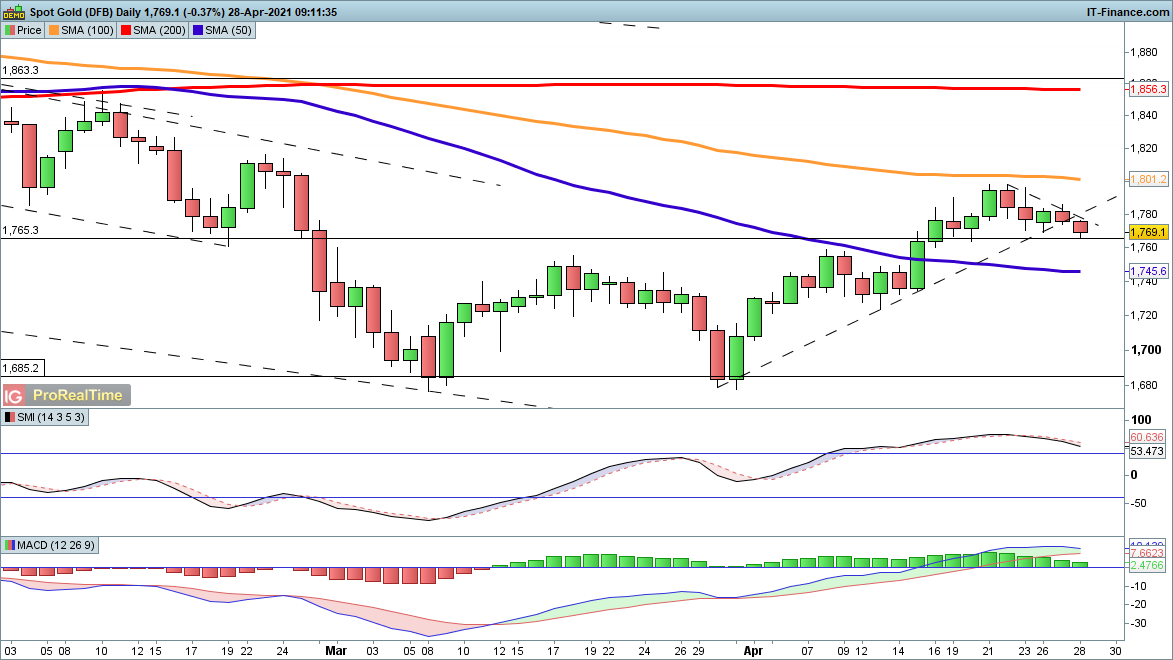 The price has broken below the line of support that has held since the end of March, opening the way to a move back to the 50-day SMA at $1745 once it falls below $1765. Buyers will want to see a reversal back above $1780 that renews the bounce from late March.
