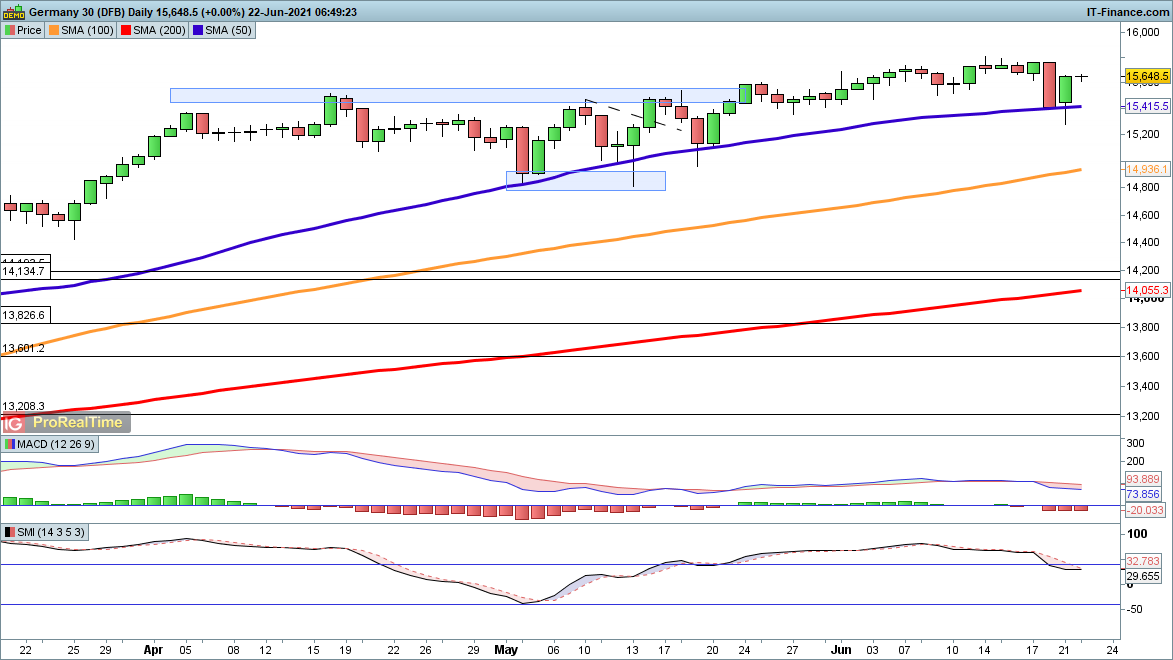 Friday’s brief weakness has been shrugged off it seems, and with yesterday seeing the price recover back above the 200-day SMA (15,415) another push to a record high seems to be in the offing. The bullish outlook has reasserted itself remarkably quickly, with sellers once again finding their limited window of opportunity being slammed shut.