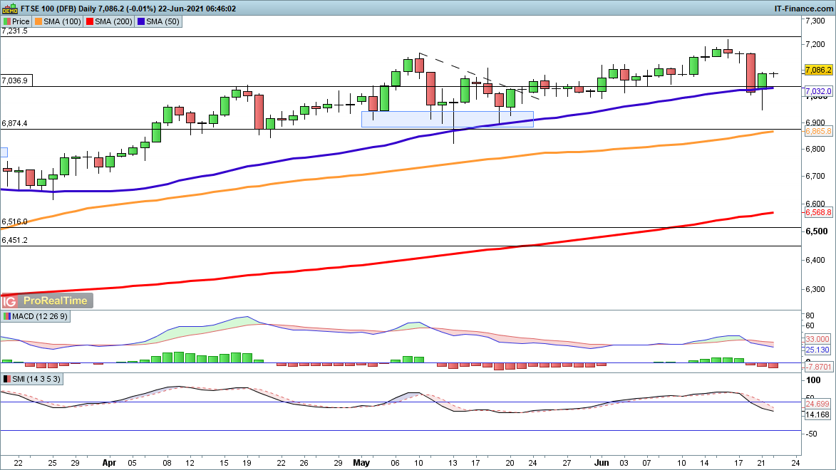 After bouncing from the 50-day simple moving average (SMA) yesterday (7032), the FTSE 100 is looking to continue its push higher, targeting 7200 once again as the uptrend revives from yesterday’s higher low. The sellers seem to have ceded control to the buyers again, and only a reversal back below 6950 would provide a more bearish outlook.
