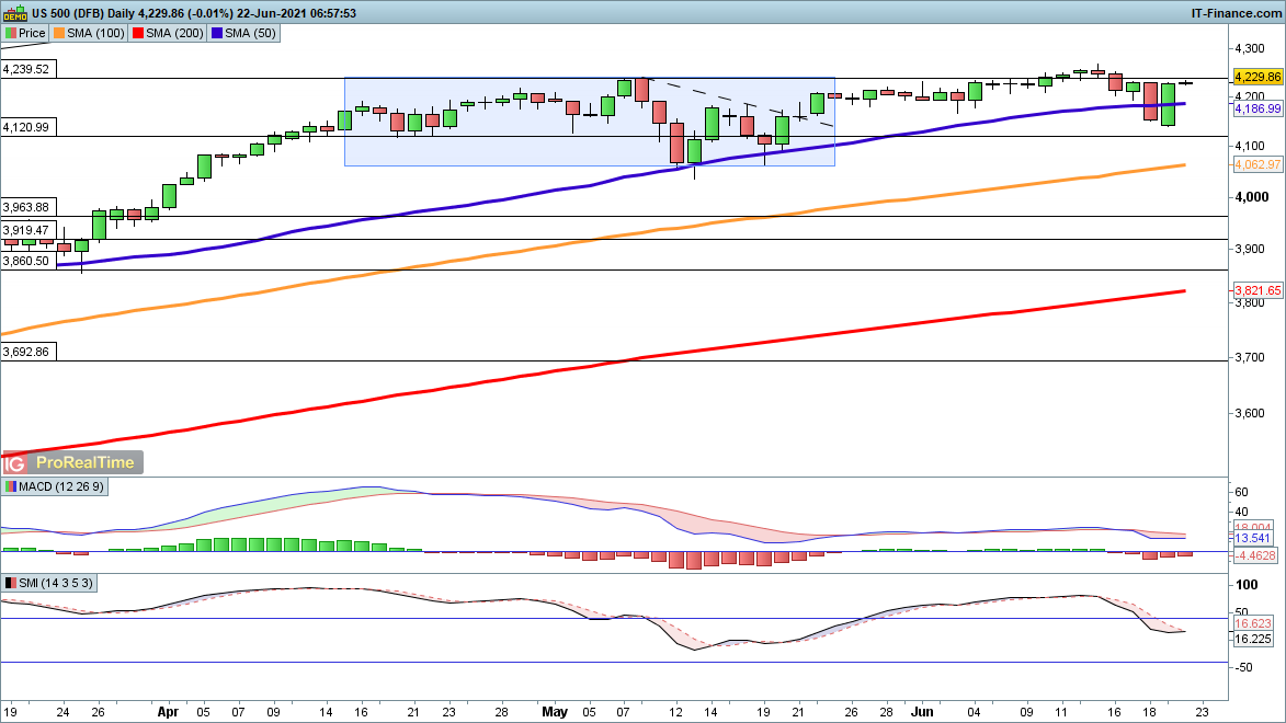 There have been several instances in the past year of a swift drop followed by an equally swift rebound, and there is no clear consensus on what happens next for the S&P 500. But for now the buyers seem to be in charge, and the bounce back above the index’s 50-day SMA (4187) seems to signal more gains ahead. Sellers will need to get the price back below 4150 to open the way to renewed downside.