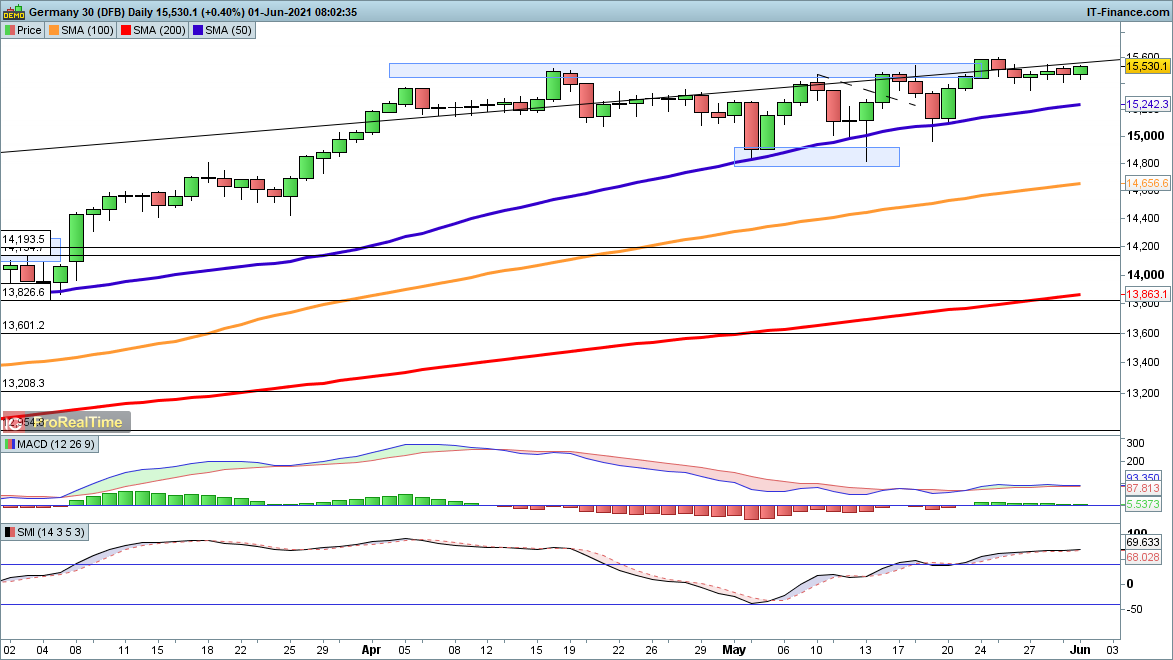 A tight range last week saw the DAX drop back below 15,400 and then recover, putting it back within range of the record highs and pointing towards a potential break higher in due course. Sellers have been unable to effect a bigger move lower in the index, which now looks to be resuming the broader move higher.