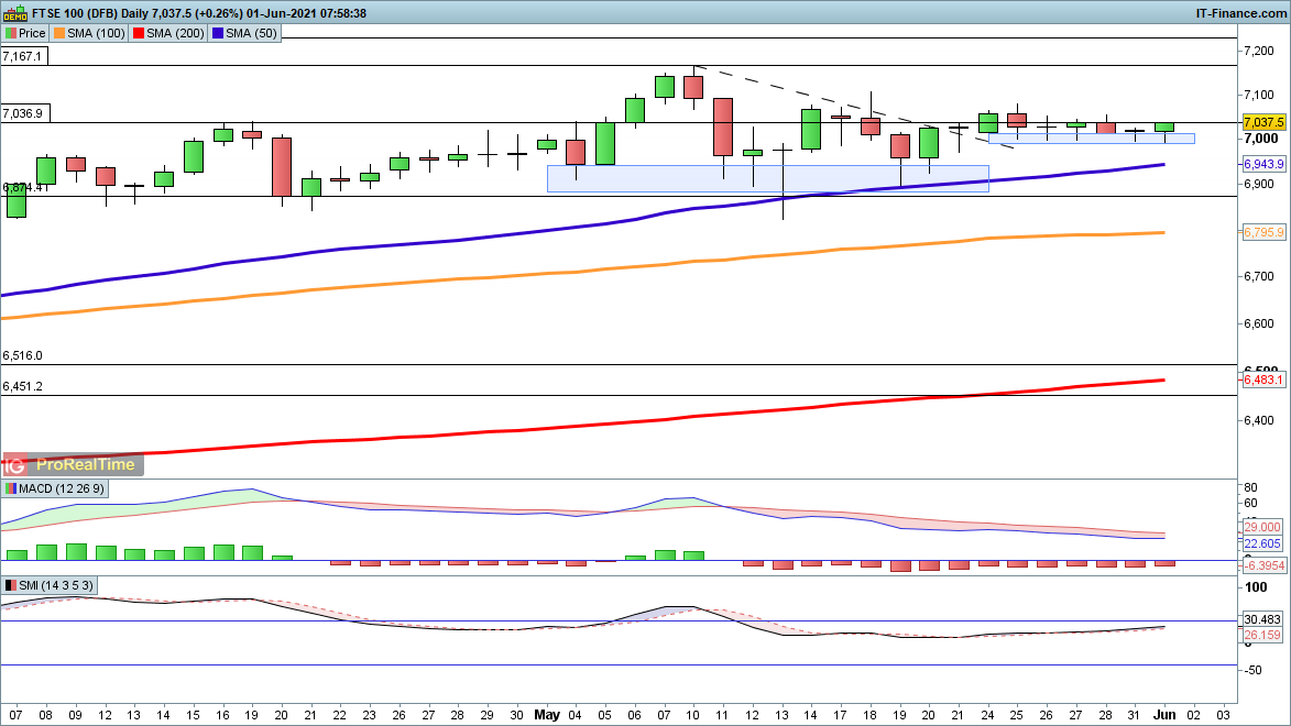 The FTSE 100 has spent over a week consolidating above 7000, holding around this zone, but without any sign that a fresh move higher is underway. However, this continued defence of 7000 looks likely to resolve into a move upwards as the prevailing trend reasserts itself, and in any case so far the sellers have not had much luck in driving the price lower. A new leg higher targets the May peak at 7167.